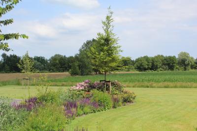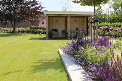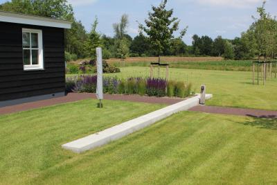 Rondom de woning is juist gekozen voor beslotenheid en gezelligheid, met doorzichten en zichtlijnen naar het landschap. Het lijnenspel van de tuin neemt al snel natuurlijke vormen aan en sluit aan bij het landschap. Het perceel heeft een oppervlakte van 3500m2 en om 'geen slaaf van eigen tuin te worden', zijn er bewuste keuzen gemaakt. Onder andere bij de oprit is gekozen voor asfaltverharding in combinatie met Zweeds graniet, veel gazon en een schapenweide. Het gazon zorgt ervoor dat de woning als het ware onderdeel van het landschap is. Bijzonder in deze tuin is ook de veranda, met een hele eigen beleving van de tuin en het landschap, een boomgaard met karakterfruitbomen en het materiaalgebruik van de terrassen en paden.