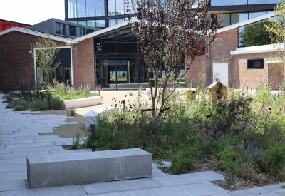 De beplanting speelt een hoofdrol. Strategisch geplaatste plantvakken zorgen ervoor dat het groen het plein visueel draagt en de omliggende bebouwing verzacht. In de vakken bloeien vaste planten, siergrassen en bloembollen, met oog voor biodiversiteit: aantrekkelijk voor bijen, vlinders én mensen.