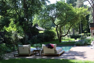 Achter de villa is een bijgebouw (guesthouse), zwembad en een heerlijk groot (zonne) terras gerealiseerd. Het zonneterras is deels uitgevoerd in Millboard (exclusieve buitenvloeren, met een meest natuurgetrouwe uitstraling). De inrit en overige verhardingen zijn uitgevoerd in een gebakken klinker. Het organische lijnenspel geeft de tuin een natuurlijke uitstraling, passend in de omgeving. Rondom het parkeren en de voordeur zijn enkele wolkhagen toegepast, die op andere plekken in de tuin terugkomen, dit zijn soort van dragers van deze tuin. De borders zijn veelal voorzien van een mix aan vaste planten, heesters en grassen.