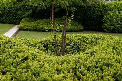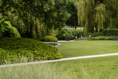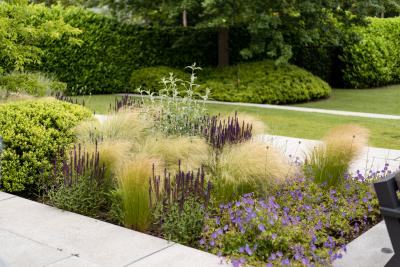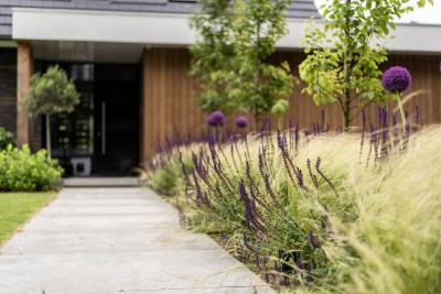 De beplanting versterkt het lijnenspel in de tuin. Bomenrijen, meerstammige bomen, grassen en kleurrijke plantvakken dragen bij aan een hele mooie tuin. De vaste plantenborders zijn vooral ingericht met vlinder- en bijenvriendelijk planten.