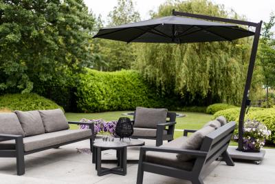 De terrassen rondom de woning vormen een uitloopgebied en verbinding met de woning. Hierdoor liggen ze meer in de tuin als tegen de woning. Het bijzondere is, dat er vanuit de woning veel groenbeleving ontstaat. Het groen wordt als het ware naar binnen getrokken, wat de zichtlijn met het park versterkt. Deze tuin bevat meerdere niveauverschillen, aflopend naar het water (Valleikanaal). Enerzijds worden ze op een natuurlijke wijze opgevangen in gazonglooiingen en anderzijds door een 'hard' lijnenspel van Oud Hollandse elementen (Schellevis). De terrassen zijn uitgevoerd in Schellevistegels 120 bij 120cm in de kleur grijs. De opritverharding is uitgevoerd in een gebakken klinker.