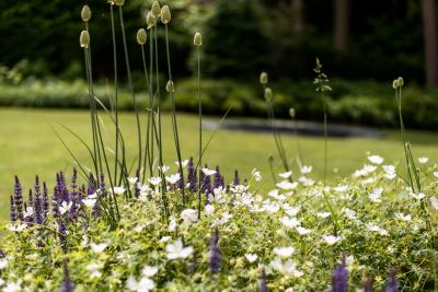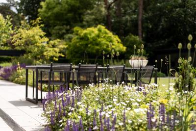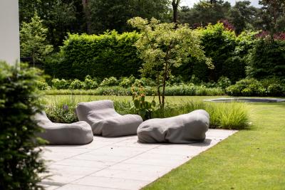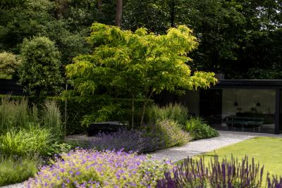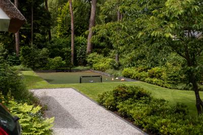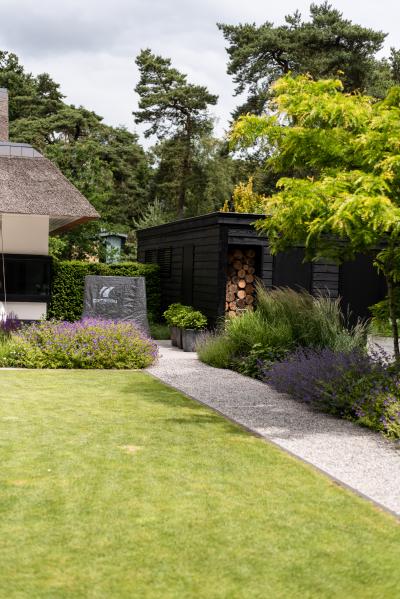 Op de overgang tussen de woning en de tuin wordt groen toegepast, wat de harde overgang verzacht. Rondom de woning komt gazon, waardoor de voor-, zij- en achtertuin een eenheid vormen. Het is een kindvriendelijke tuin met een trampoline en hockeyveld. Aansluitend aan de woning ligt een riant terras voorzien van een keramische tegel. In het terras zijn plantvakken aangebracht, met verschillende soorten vaste bloeiende planten en grassen, zodat de groenbeleving van dichtbij wordt ervaren. De achtertuin is een heerlijke plek om te verblijven met een veranda en een jacuzzi. Ook hier is een plantvak met veel verschillende soorten vaste planten en grassen. De oprit en paden in de tuin hebben een half verharding wat de tuin extra informeel en gezellig maakt. Ook de garage is door Wencop hoveniers gerealiseerd.