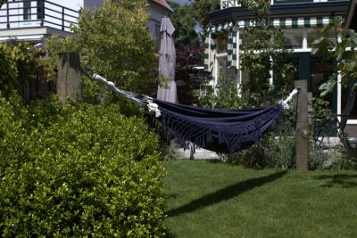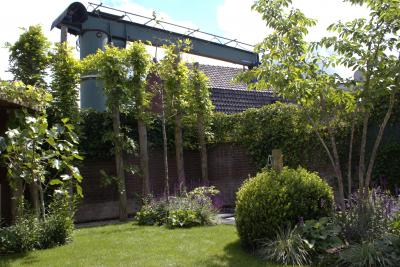 Langs de erfgrens zijn klimpalen met klimplanten voorzien om de hijskraan zoveel als mogelijk uit het zicht te onttrekken, zodat dat het heel veel ruimte vraagt in de tuin.