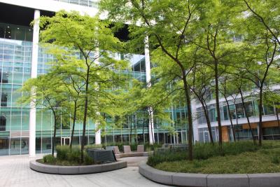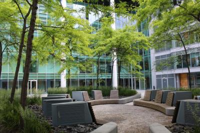 Er zijn zitelementen toegevoegd om plantenbakken te creƫren voor bomen. In deze plantenbakken zijn tevens de luchtafvoeren van de parkeergarage verwerkt.