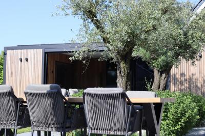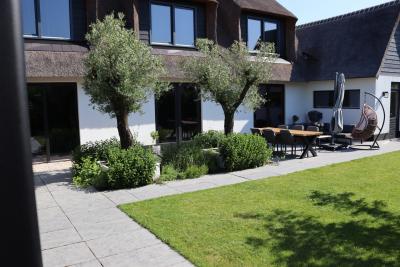 De natuursteen terrastegels zijn hergebruikt. Het terras is kleiner en knusser geworden, onder de druprand van de rietenkap is een grindstrook voorzien. De vrijgekomen terrastegels zijn opnieuw toegepast in de tuin. In de tuin is een kant-en-klare Verior wellness unit geplaatst met jacuzzi, sauna en douche.