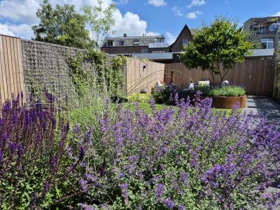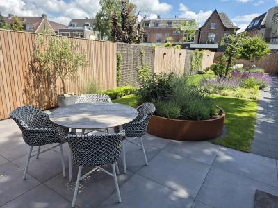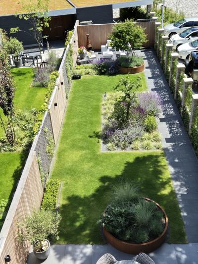 De tuinen zijn relatief smal ten opzichte van de diepte van de tuin, deze uitdaging gaan wij graag aan. De verbinding van de woning richting de carport aan de achterzijde, middels een pad is juist gelegd aan de schaduwzijde van de tuin. Het gazon is het verbindend element in deze tuin, met een aantal plantvakken. Bijzonder zijn de 2 stuks cortenstalen verhoogde plantenbakken. Dit verrassende element zorgt ervoor dat er iets gebeurt wat je niet verwacht en daardoor wordt het een bijzondere beleving.