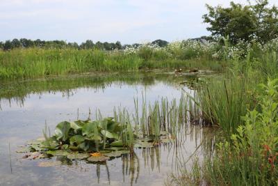 Totale oppervlakte van het perceel is ruim 10.000m2, ruim 6000m2 wordt ingericht als `natuur`, bestaande uit een vijver van 800m2 met natuurvriendelijke oever, daarnaast inheemse beplantingen en een kruidenmengsel. Het geheel is middels een hal verhard paadje toegankelijk.