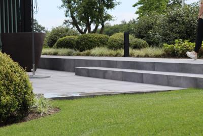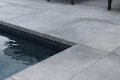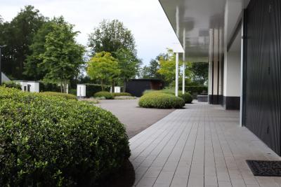 De terrassen zijn voorzien van een keramische terrastegel, de inrit is voorzien van asfalt, dit om het onderhoud aan de verhardingen te beperken. Detail is wel de zwembadrand die doorloopt vanuit de keramische terrastegel.