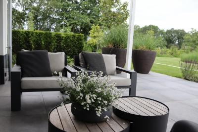 De accessoires in de tuin maken het geheel af, oa. de plantenbakken van Atelier vierkant.