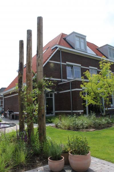Rondom de terrassen zijn er plantvakken met uitbundige, rijkbloeiende en geurende bloemen te vinden. De klimpalen met klimplanten versterken de groenbeleving. Qua bomen hebben we gekozen voor klimaatbestendige bomen. In deze tuin is daarom de boomheester Gleditsia tria 'Sunburst' geplaatst.