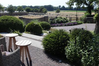 Er is gekozen voor een tuin met veel privacy, door het aanbrengen van groenblijvende beplantingen langs de erfgrens. Daarnaast is er zoveel mogelijk aansluiting gezocht bij het landschappelijk karakter vanuit de omgeving. De natuurlijke hoogteverschillen vanuit de omgeving zijn doorgevoerd in deze tuin. En vooral voorzien van gazon, dit vereenvoudigd ook het onderhoud. Daarnaast is het vanuit de woning ook zichtbaar dat het landschap als het ware binnenkomt. De villa vormt een eenheid met de omgeving.