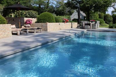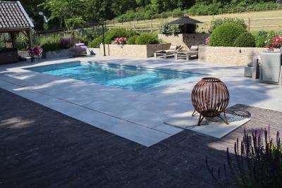 Een aanwezig schuur is omgetoverd tot een prachtig bijgebouw, met ruimte voor een garage, berging, sanitaire voorzieningen, sauna en loungeplek met bar en openhaard. Dit bijgebouw is zo gesitueerd dat dit de privacy rondom het zwembad waarborgt. Bij het zwembaddeel in de tuin is gekozen om juist hardere overgangen te maken om het hoogteverschil te overbruggen. Dit versterkt de intimiteit en geeft daarmee de juiste beleving. Rondom het zwembad is gekozen om de terrastegels door te laten lopen ook als zwembadrand, zodoende is het zwembad onderdeel van het terras en niet als los element in het zwembadterras.