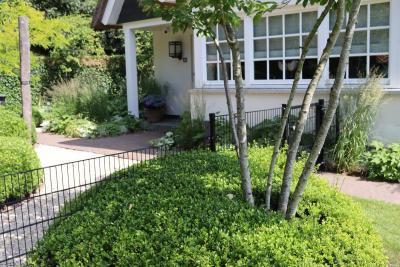 De entree van de woning is compleet getransformeerd tot een uitnodigende en stijlvolle binnenkomer. Door het plaatsen van wolkhagen is er gekozen voor een informele, zachte sfeer met een hoge aaibaarheidsfactor. Deze speelse, organisch gesnoeide hagen geven direct karakter aan de toegang tot de woning en zorgen voor een natuurlijke overgang tussen privé en buitenwereld.