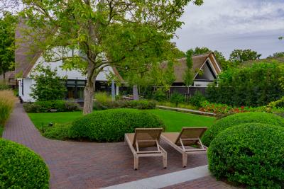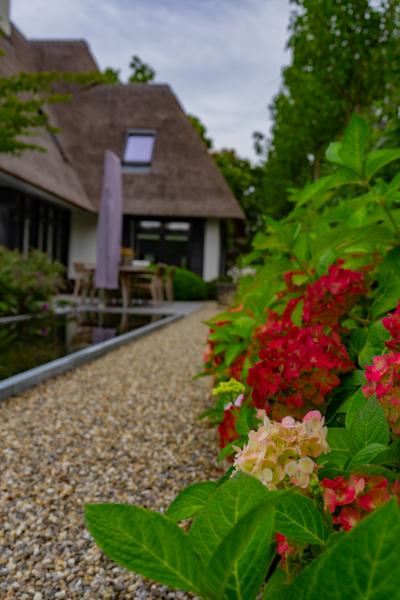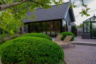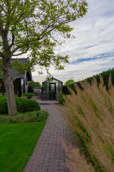 Er zijn hoogwaardige materialen gebruikt, o.a. graniettegels voor de terrassen en doorlopend in de tuinkamer. De tegels zijn gecombineerd met een gebakken klinker, in een kleur die terugkomt in de villa. De spiegelvijver is voorzien van een zinken rand. Bijzonder is ook de (inpassing) tuinkas. De tuinkamer is onderdeel van het bijgebouw (o.a. garage) en ligt hoger ten opzichte van de villa, dit hoogteverschil is juist heel mooi geaccentueerd in de tuin.