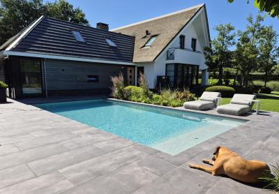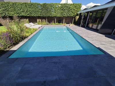 Opvallend detail is de zwembadrand, deze is gelijk aan de terrastegel. Hierdoor is het zwembad echt onderdeel van het terras en dat schept een rustiger beeld.