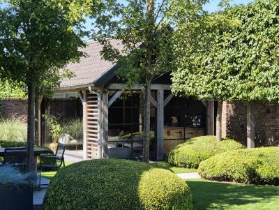 De locatie is bepaald doordat deze plek in de tuin, de meeste zonuren heeft. Daarnaast vormt het bijgebouw met o.a. buitenkeuken en sauna een mooie afscheiding tussen het zwembad en de buren.